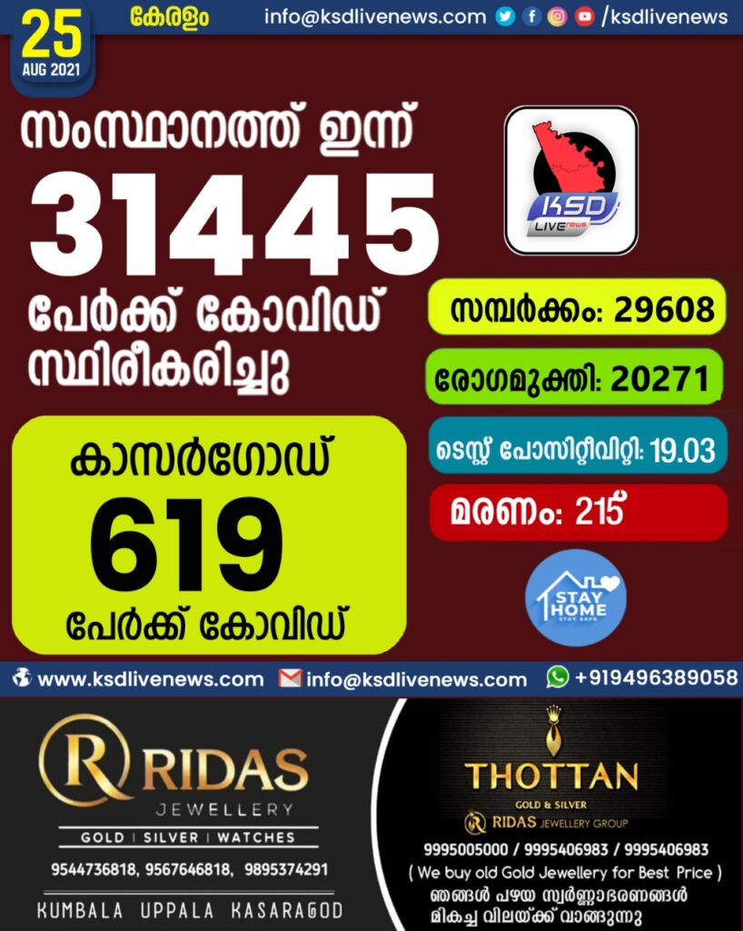 കോവിഡിൽ വിറച്ച് കേരളം ; സംസ്ഥാനത്ത് ഇന്ന് 31445 പേർക്ക് കോവിഡ് സ്ഥിരീകരിച്ചു. സമ്പർക്കം വഴി 29608 പേർക്കും ; ആശ്വാസമായി 20271 പേർക്ക് രോഗ മുക്തിയും ; കാസർഗോഡ് ജില്ലയിൽ 619 പേർക്ക് പുതിയ കോവിഡ് കേസുകൾ ; മരണം 215