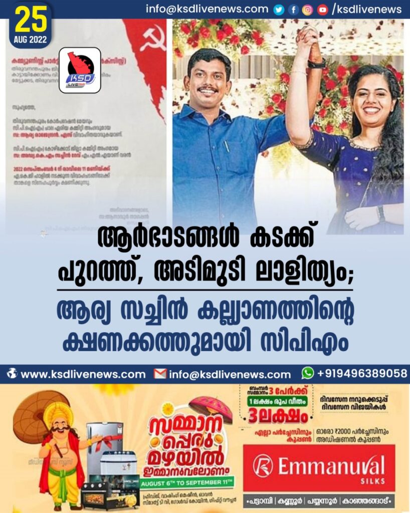 ആര്ഭാടങ്ങള് ‘കടക്ക് പുറത്ത്’, അടിമുടി ലാളിത്യം; ആര്യ-സച്ചിന് കല്ല്യാണത്തിന്റെ ക്ഷണക്കത്തുമായി സിപിഎം
