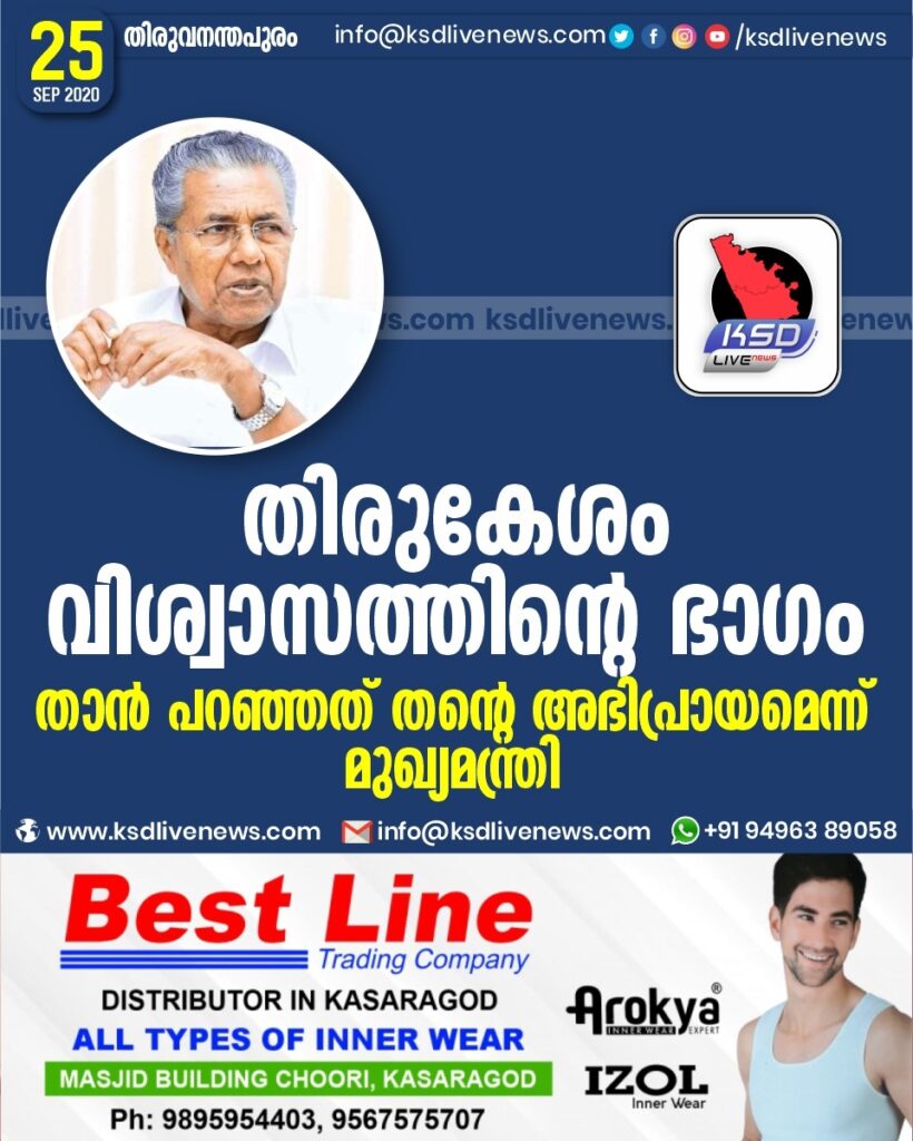 തിരുകേശം വിശ്വാസത്തിന്റെ ഭാഗം ; താന് പറഞ്ഞത് തന്റെ അഭിപ്രായമെന്ന് മുഖ്യമന്ത്രി