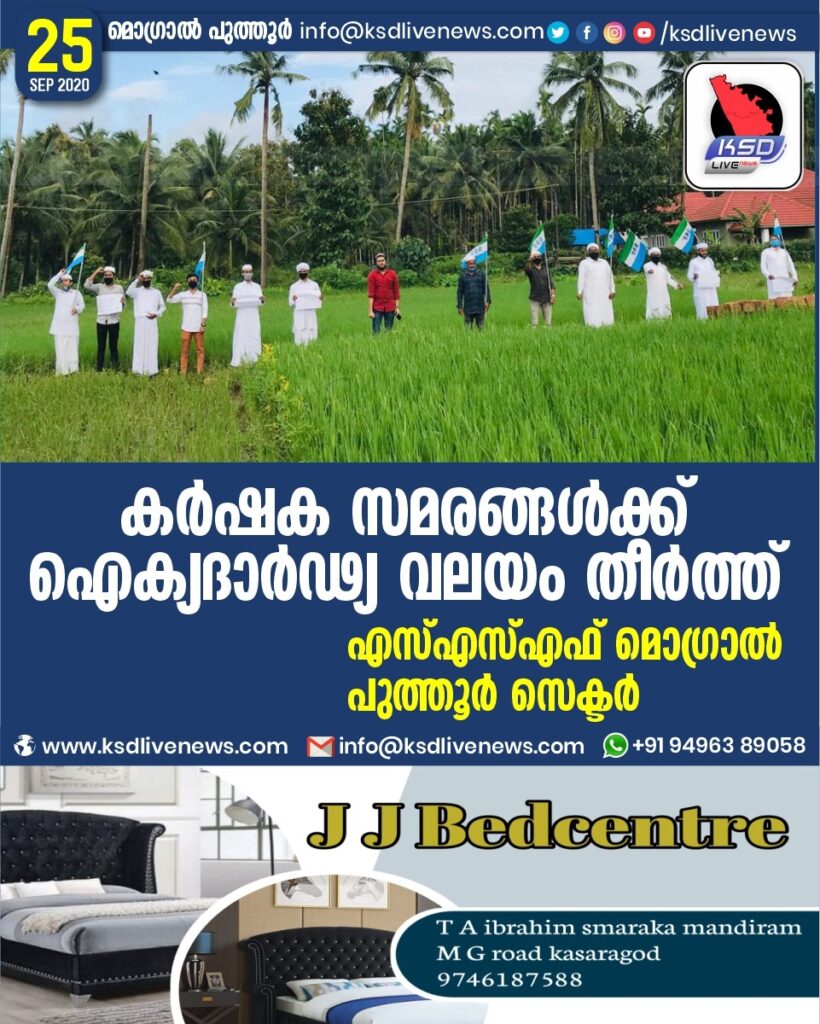 മൊഗ്രാൽ പുത്തൂർ: കേന്ദ്ര സർക്കാർ നടപ്പിലാക്കുന്ന കർഷക ബില്ലിനെതിരെ രാജ്യത്തിന്റെ പല ഭാഗങ്ങളിൽ നിന്നും ഉയർന്നു വരുന്ന പ്രതിഷേധ സമരങ്ങൾക്ക് എസ്എസ് എസ് മൊഗ്രാൽ പുത്തൂർ സെക്ടർ ഐക്യദാർഢ്യം അർപ്പിച്ചു. കാർഷിക ബില്ലിനെതിരെ ഉയരുന്ന ശബ്ദങ്ങൾക്ക് കരുത്ത് പകരാൻ വിദ്യാർത്ഥി സമൂഹവും സംഘടനകളും മുന്നോട്ട് വരണമെന്നും പരിപാടിയിൽ ആവശ്യപ്പെട്ടു.
