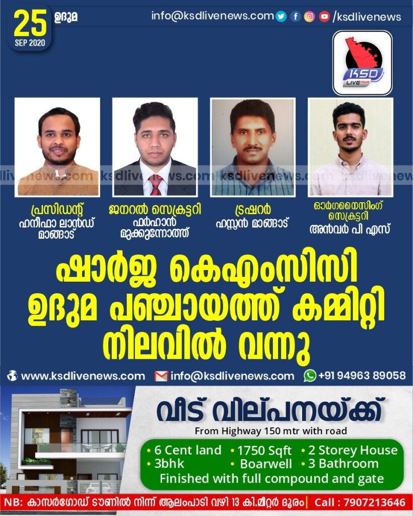 ഷാർജ കെഎംസിസി ഉദുമ പഞ്ചായത്ത് ഭാരവാഹികളായി ഹനീഫ് ലാൻഡ് മാങ്ങാട് (പ്രസി.), ഫർഹാൻ മുക്കുന്നോത്ത് (ജന. സെക്ര.), ഹസ്സൻ മാങ്ങാട് (ട്രഷറർ) അൻവർ പി എസ് (ഓർഗ. സെക്ര.) സലാം കല്ലായി, ശകീർ കോട്ടിക്കുളം, സിയാദ് താമരക്കുഴി, നജീബ് ഈചിലിങ്കാൽ, സഫ്‌വാൻ മാങ്ങാട്, (വൈ. പ്രസി.), ഷംസു മീത്തൽ മാങ്ങാട്, റഷീദ് കോട്ടിക്കുളം, ഷമീംതച്ചറകുന്നു, ഇർശാദ് മുക്കുന്നോത്ത്, സാബികുൽ ഇശാം (സെക്ര.) എന്നിവരെ തിരഞ്ഞെടുത്തു.