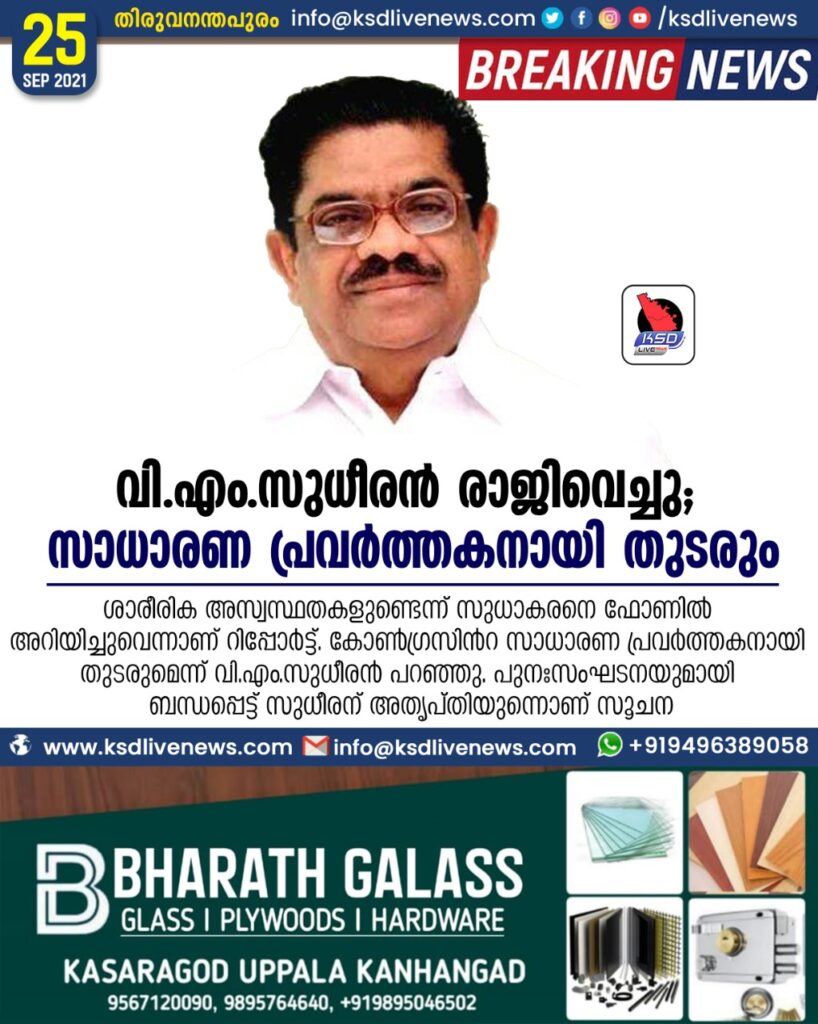 വി.എം.സുധീരൻ രാജിവെച്ചു; സാധാരണ പ്രവർത്തകനായി തുടരും