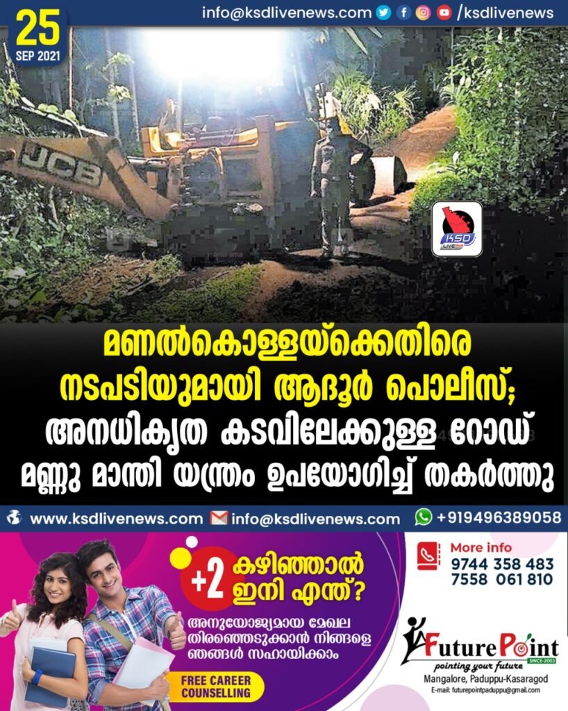 മണൽകൊള്ളയ്ക്കെതിരെ നടപടിയുമായി ആദൂർ പൊലീസ്; അനധികൃത കടവിലേക്കുള്ള റോഡ് മണ്ണു മാന്തി യന്ത്രം ഉപയോഗിച്ച് തകർത്തു