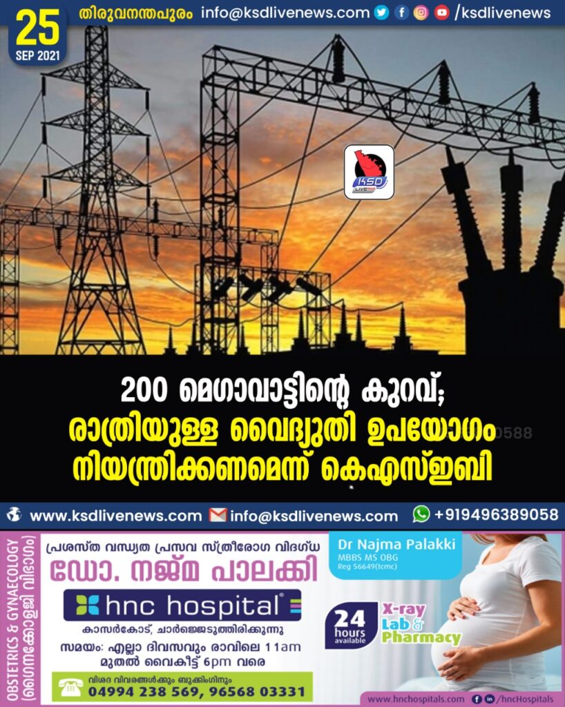 200 മെഗാവാട്ടിന്റെ കുറവ്; രാത്രിയുള്ള വൈദ്യുതി ഉപയോഗം നിയന്ത്രിക്കണമെന്ന് കെഎസ്ഇബി