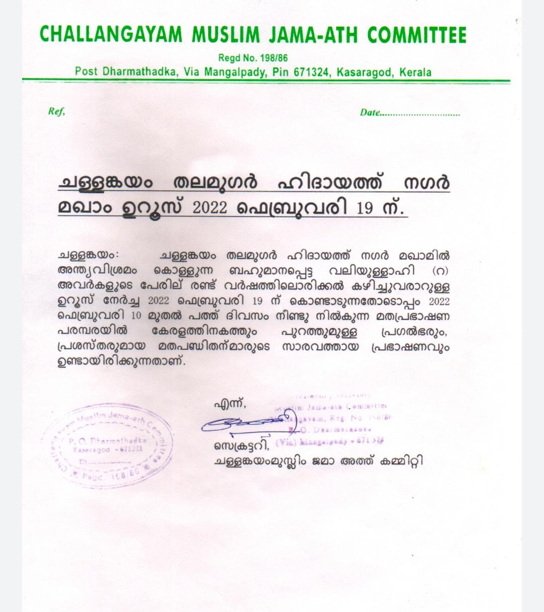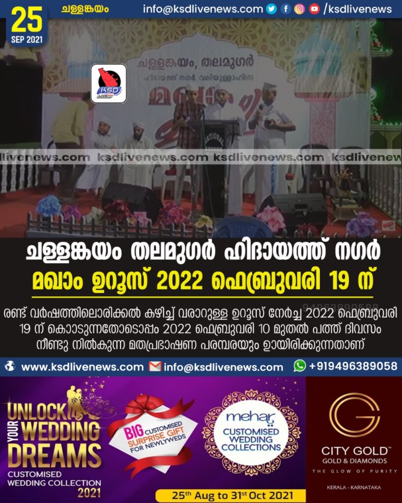 ചള്ളങ്കയം തലമുഗർ ഹിദായത്ത് നഗർ മഖാം ഉറൂസ് 2022 ഫെബ്രുവരി 19 ന്
