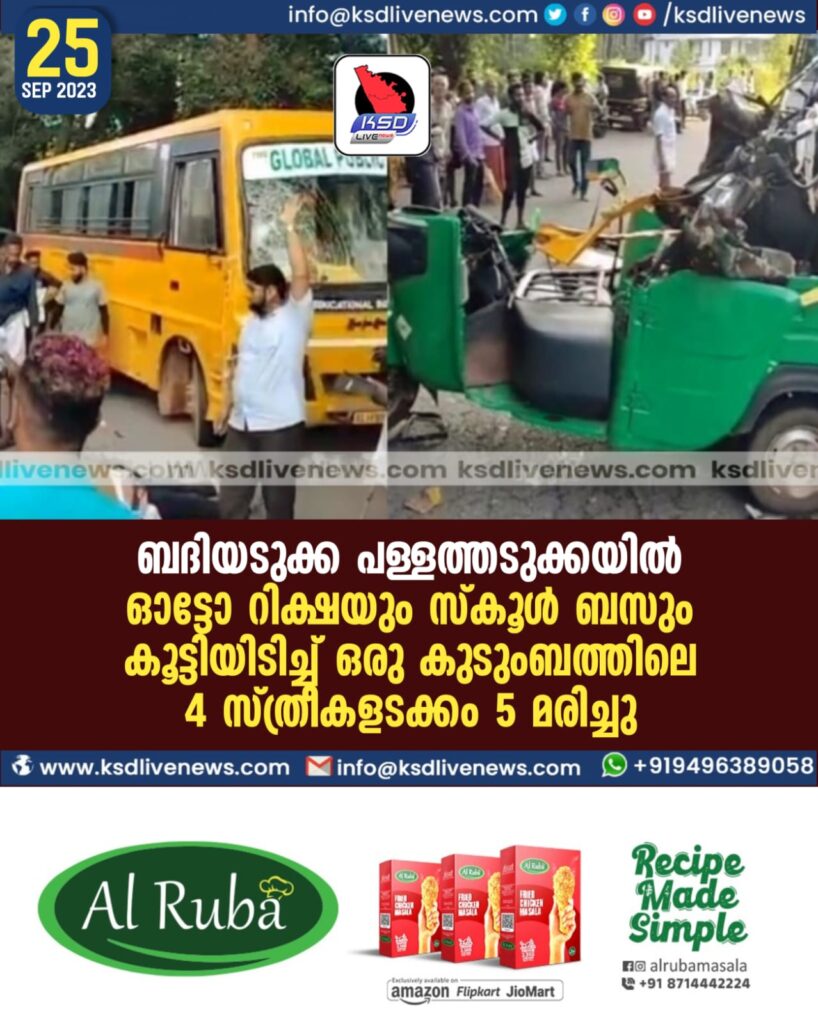 ബദിയടുക്ക പള്ളത്തടുക്കയിൽ ഓട്ടോ റിക്ഷയും സ്കൂൾ ബസും കൂട്ടിയിടിച്ച് ഒരു കുടുംബത്തിലെ 4 സ്ത്രീകളടക്കം 5 മരിച്ചു