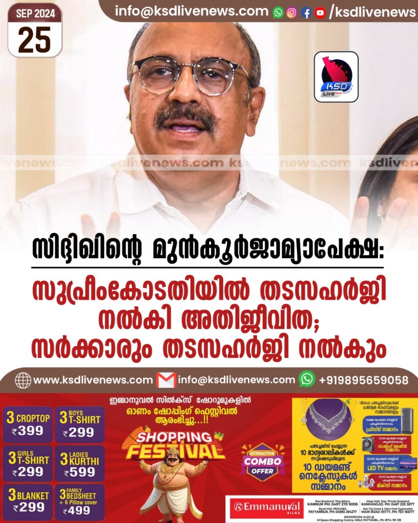 സിദ്ദിഖിന്റെ മുൻകൂര്ജാമ്യാപേക്ഷ: സുപ്രീം കോടതിയില് തടസഹര്ജി നല്കി അതിജീവിത; സര്ക്കാരും തടസഹര്ജി നല്കും