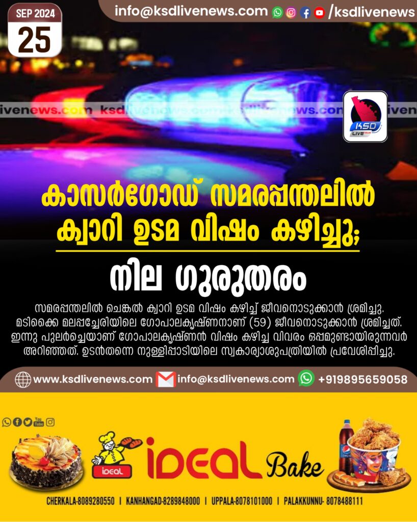 കാസര്ഗോഡ് സമരപ്പന്തലില് ക്വാറി ഉടമ വിഷം കഴിച്ചു; നില ഗുരുതരം