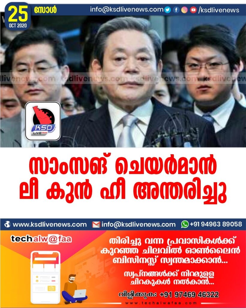 സോൾ: സാംസങ് ഇലക്ട്രോണിക്സ് ചെയർമാൻ ലീ കുൻ ഹീ (78) അന്തരിച്ചു.ദക്ഷിണ കൊറിയൻ സ്ഥാപനമായ സാംസങിനെ ആഗോള ടെക് ഭീമനാക്കി മാറ്റിയ ലീ 2014 മുതൽ ഹൃദയസംബന്ധമായ അസുഖങ്ങളെ തുടർന്ന് കിടപ്പിലായിരുന്നു.പ്രാദേശിക ബിസിനസിൽ നിന്നാണ് സാംസങിനെ ലീ ലോകത്തിലെ വൻകിട ഇല്ക്ട്രോണിക്സ് നിർമാതാക്കളാക്കി മാറ്റിയത്. പിതാവ് ലീ ബ്യൂങ് ചൂളിന്റെ മരണ ശേഷം 1987ലാണ് ലീ കമ്പനിയുടെ അധികാരമേറ്റെടുത്തത്. രണ്ടുതവണ അദ്ദേഹം ശിക്ഷിക്കപ്പെട്ടിട്ടുണ്ട്.