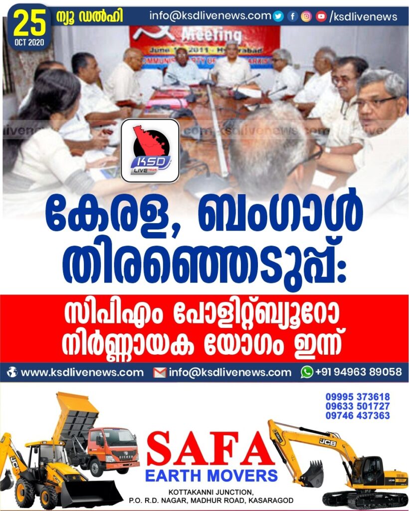 ന്യൂഡൽഹി : കേരള ബംഗാൾ നിയമസഭ തിരഞ്ഞെടുപ്പുകൾ ചർച്ച ചെയ്യുന്നതിനായി സി.പി.എം പോളിറ്റ്ബ്യൂറോയുടെ നിർണ്ണായക യോഗം ഇന്നു ചേരും. ഇരു സംസ്ഥാനങ്ങളിലെയും തിരഞ്ഞെടുപ്പ് സഖ്യങ്ങളുടെ ധാരണ സംബന്ധിച്ച പ്രാഥമിക ചർച്ചകളാണ് ഓൺലൈനിൽ ചേരുന്ന പിബിയിൽ നടക്കുക. വിശദമായ ചർച്ചകൾ അടുത്ത കേന്ദ്രകമ്മറ്റിയിൽ ഉണ്ടാകും.