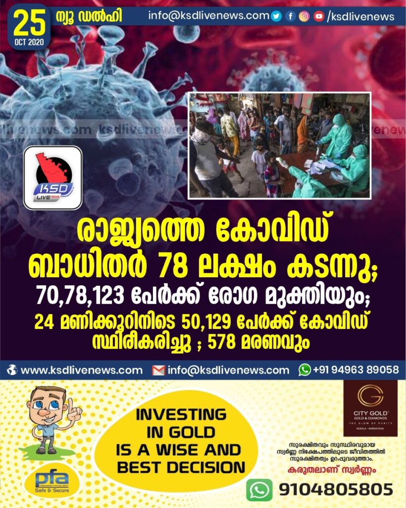 രാജ്യത്തെ കോവിഡ് ബാധിതർ 78 ലക്ഷം കടന്നു ; കടന്നു ; 70,78,123 പേർക്ക് രോഗ മുക്തിയും ;