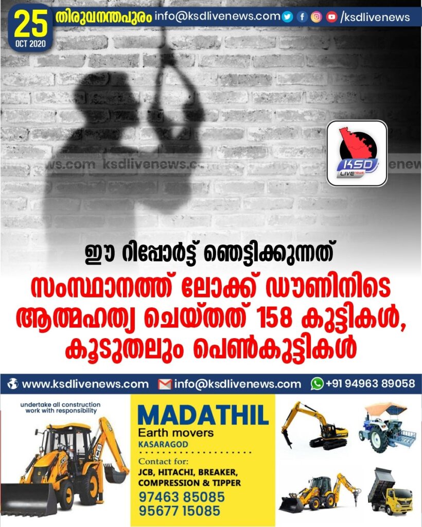 സംസ്ഥാനത്ത് ലോക്ക് ഡൗണിനിടെ ആത്മഹത്യ ചെയ്തത് 158 കുട്ടികള്, കൂടുതലും പെണ്കുട്ടികള്