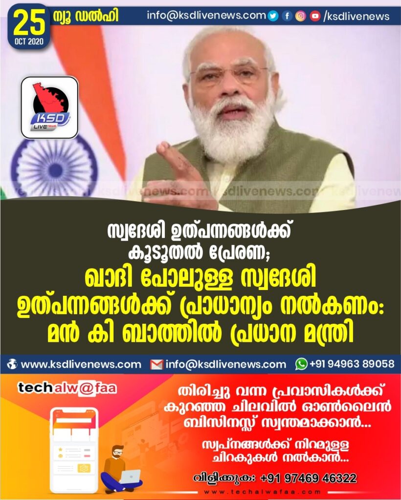 ഖാദി പോലുള്ള സ്വദേശി ഉത്പന്നങ്ങൾക്ക് പ്രാധാന്യം നൽകണം : മൻ കി ബാത്തിൽ പ്രധാന മന്ത്രി