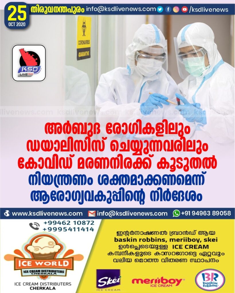 അർബുദ രോഗികളിലും ഡയാലിസിസ് ചെയ്യുന്നവരിലും കോവിഡ് മരണനിരക്ക് കൂടുതൽ ; നിയന്ത്രണം ശക്തമാക്കണമെന്ന് ആരോഗ്യവകുപ്പിന്റെ നിർദേശം