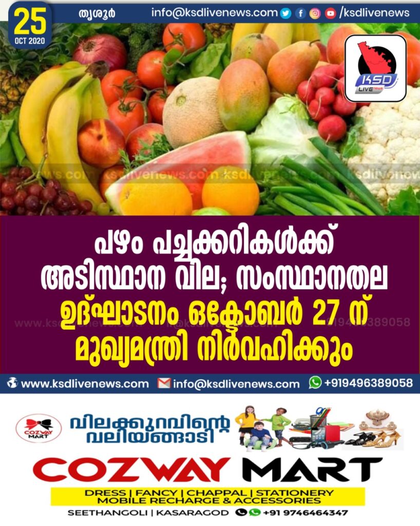പഴം പച്ചക്കറികള്ക്ക് അടിസ്ഥാന വില; സംസ്ഥാനതല ഉദ്ഘാടനം ഒക്ടോബര് 27 ന് മുഖ്യമന്ത്രി നിർവഹിക്കും