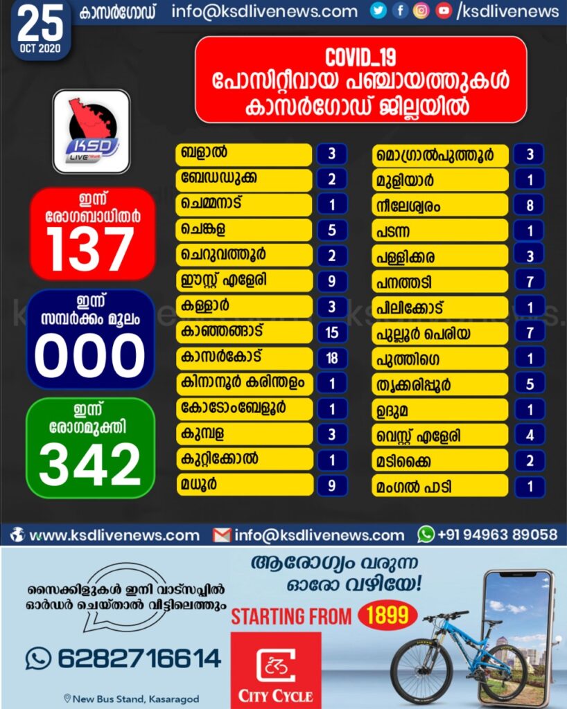 കാസർഗോഡ് ജില്ലയിൽ ഇന്ന് കോവിഡ് പോസിറ്റീവായവരുടെ പഞ്ചായത്ത് തിരിച്ചുള്ള സ്ഥിതി വിവര കണക്ക്