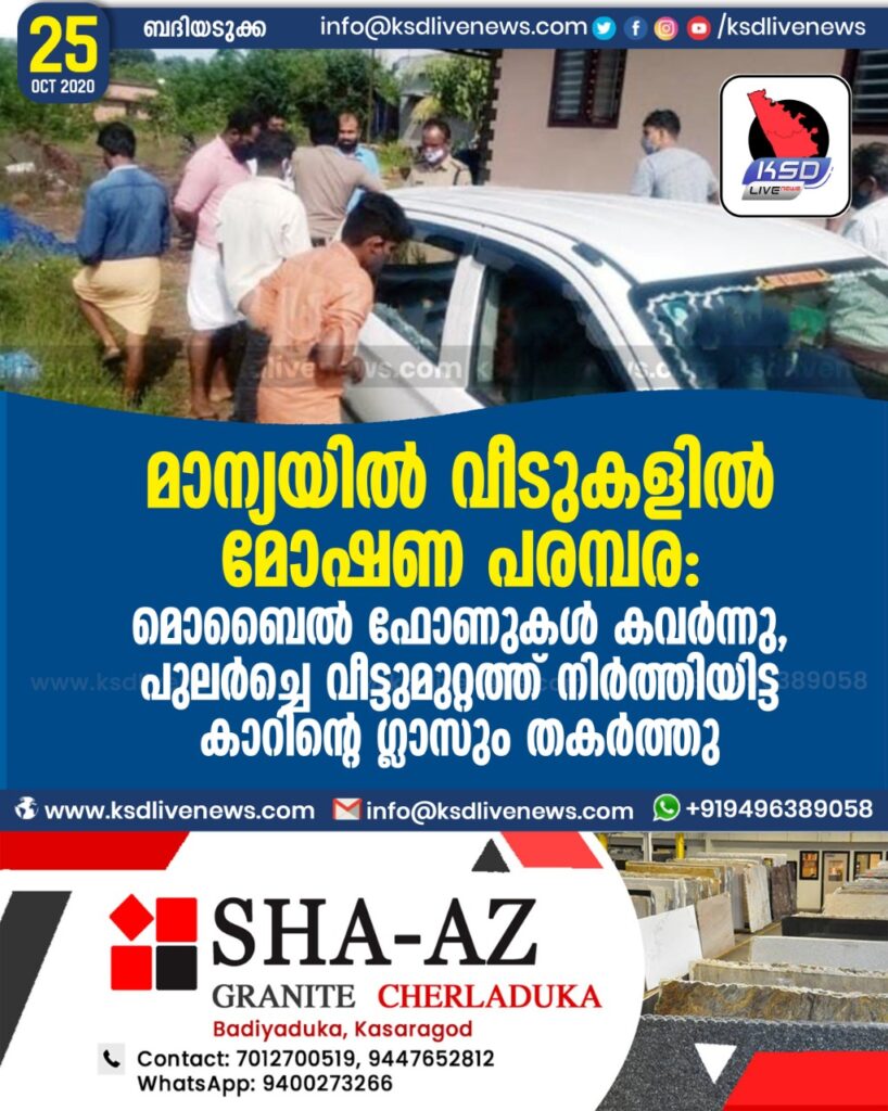 മാന്യയില് വീടുകളില് മോഷണ പരമ്പര : മൊബൈല് ഫോണുകള് കവർന്നു, പുലർച്ചെ വീട്ടുമുറ്റത്ത് നിര്ത്തിയിട്ട കാറിന്റെ ഗ്ലാസും തകര്ത്തു