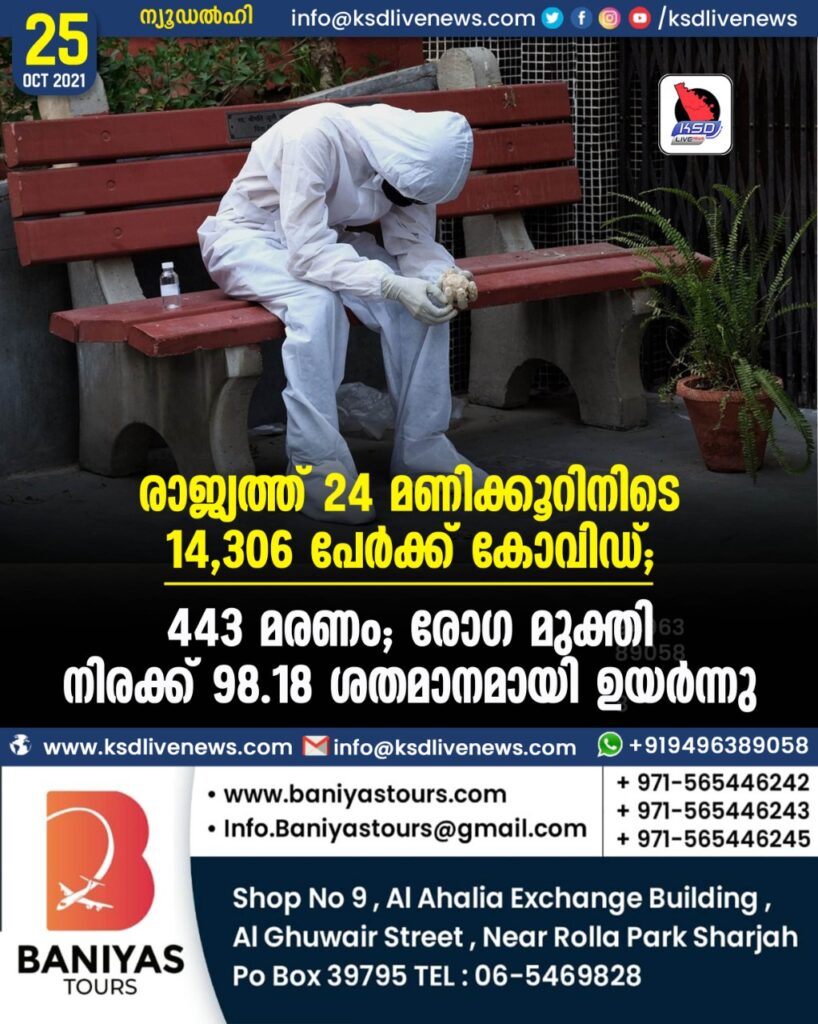 രാജ്യത്ത് 24 മണിക്കൂറിനിടെ 14,306 പേർക്ക് കോവിഡ്; 443 മരണം; രോഗ മുക്തി നിരക്ക് 98.18 ശതമാനമായി ഉയർന്നു