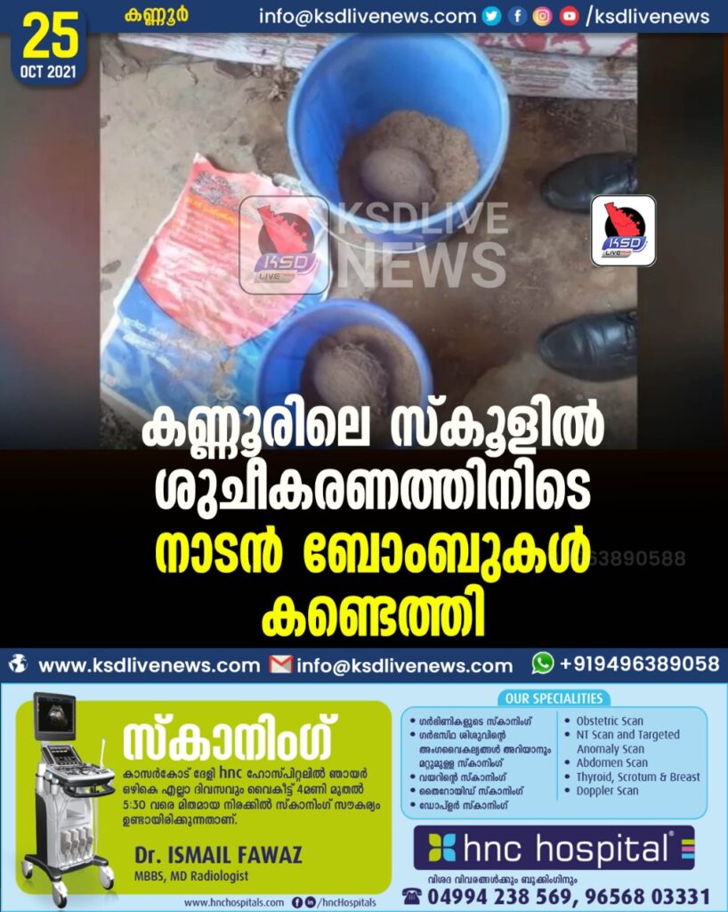 കണ്ണൂരിലെ സ്‌കൂളില്‍ ശുചീകരണത്തിനിടെ നാടന്‍ ബോംബുകള്‍ കണ്ടെത്തി