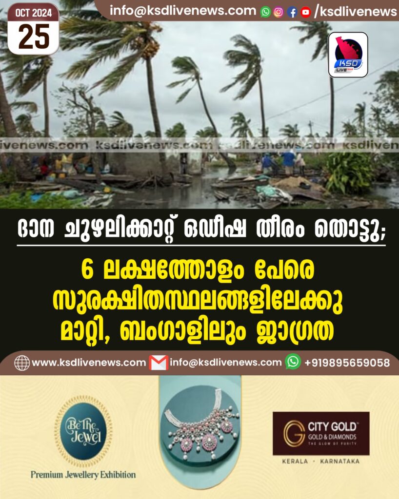 ദാന ചുഴലിക്കാറ്റ് ഒഡീഷ തീരം തൊട്ടു; 6 ലക്ഷത്തോളം പേരെ സുരക്ഷിതസ്ഥലങ്ങളിലേക്കു മാറ്റി, ബംഗാളിലും ജാഗ്രത