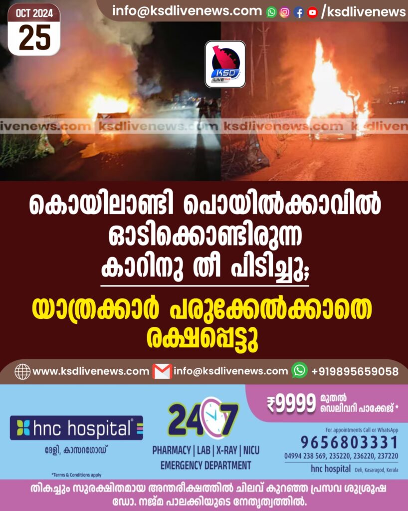 കൊയിലാണ്ടി പൊയിൽക്കാവിൽ ഓടിക്കൊണ്ടിരുന്ന കാറിനു തീ പിടിച്ചു; യാത്രക്കാർ പരുക്കേൽക്കാതെ രക്ഷപ്പെട്ടു