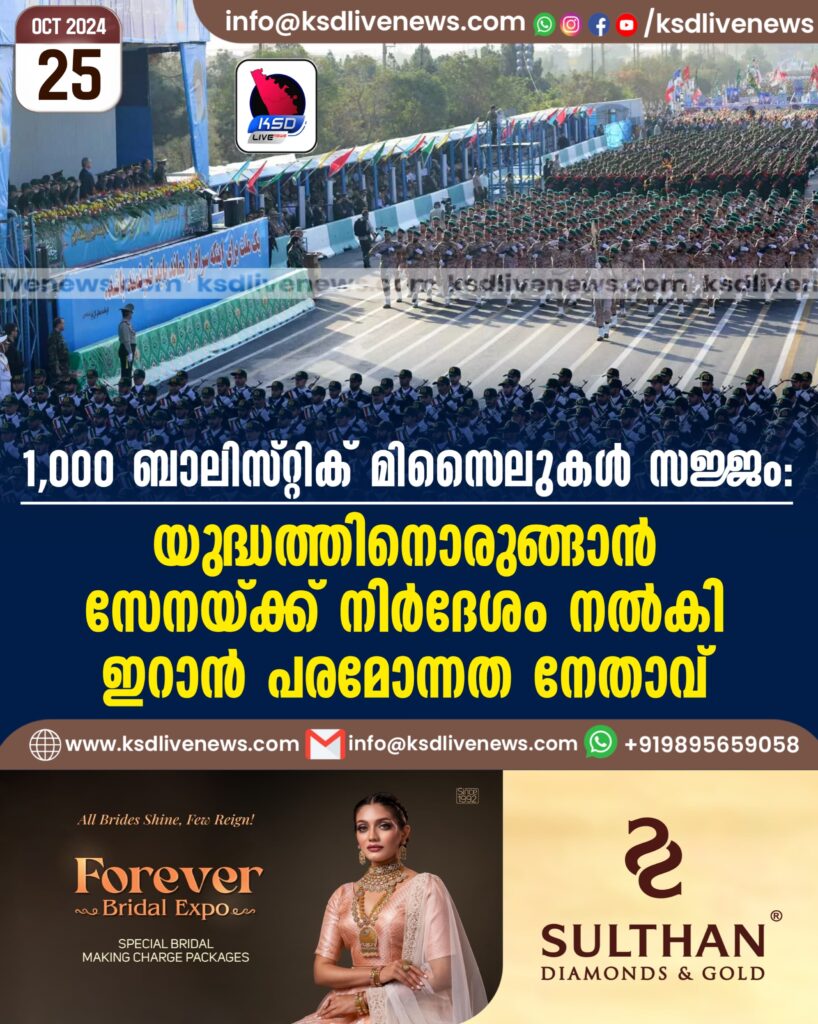 1,000 ബാലിസ്റ്റിക് മിസൈലുകൾ സജ്ജം: യുദ്ധത്തിനൊരുങ്ങാൻ സേനയ്ക്ക് നിർദേശം നൽകി ഇറാൻ പരമോന്നത നേതാവ്