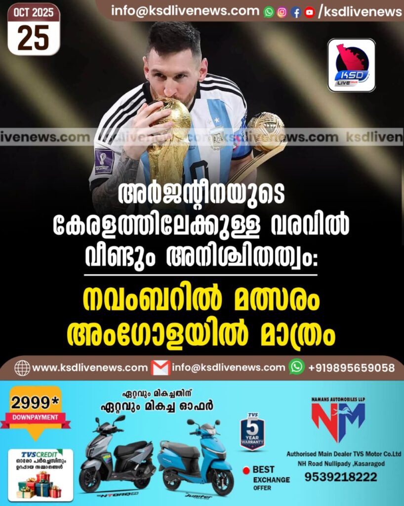 അർജന്റീനയുടെ കേരളത്തിലേക്കുള്ള വരവിൽ വീണ്ടും അനിശ്ചിതത്വം; നവംബറിൽ മത്സരം അംഗോളയില്‍ മാത്രം