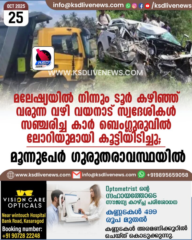 മലേഷ്യയിൽ നിന്നും ടൂർ കഴിഞ്ഞ് വരുന്ന വഴി വയനാട് സ്വദേശികൾ സഞ്ചരിച്ച കാർ ബെംഗ്ലുരുവിൽ ലോറിയുമായി കൂട്ടിയിടിച്ചു; മൂന്നുപേർ ഗുരുതരാവസ്ഥയിൽ