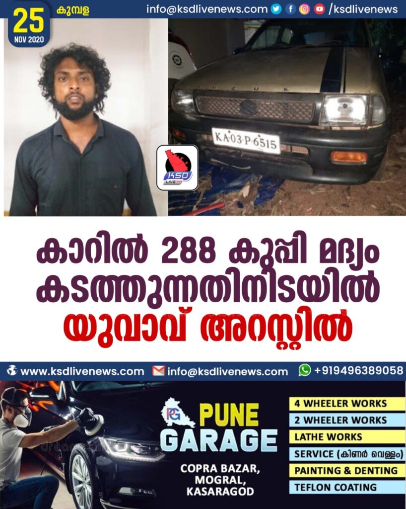 കുമ്പള: കാറിൽ മദ്യം കടത്തുന്നതിനിടയിൽ യുവാവിനെ കുമ്പള പോലീസ് അറസ്റ്റ് ചെയ്തു. കുമ്പളയിലെ നിതേഷ് (27) ആണ് പിടിയിലായത്. ബംബ്രാണ-കഞ്ചിക്കട്ട റോഡിൽ കുണ്ടാപ്പുവിൽ വാഹനപരിശോധനയിലാണ് 288 കുപ്പി മദ്യം കണ്ടെടുത്തത്. കുമ്പള എസ്.ഐ. എ.സന്തോഷ്കുമാർ, എ.എസ്.ഐ. കെ.പി.വി.രാജീവൻ, രതീഷ്, സി.പി.ഒ.മാരായ മനോജ്, പ്രശോഭ് എന്നിവർ പരിശോധനയിൽ പങ്കെടുത്തു.