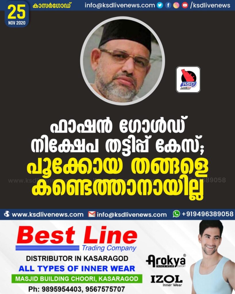 കാഞ്ഞങ്ങാട് :ഫാഷൻ ഗോൾഡ് നിക്ഷേപത്തട്ടിപ്പ് കേസിലെ മുഖ്യപ്രതി ടി.കെ. പൂക്കോയ തങ്ങളെ കണ്ടെത്താനുള്ള പ്രത്യേക അന്വേഷണസംഘത്തിന്റെ കർണാടകയിലെ തിരച്ചൽ വിഫലം. ബെംഗളൂരുവിലും മംഗളൂരുവിലുമുൾപ്പെടെ ദിവസങ്ങളോളം അന്വേഷിച്ചെങ്കിലും കണ്ടെത്താനായില്ല. മൂന്നുപേർ ബെംഗളൂരുവിലേക്കും നാലുപേർ മംഗളൂരുവിലേക്കുമാണ് പോയിരുന്നത്. പൂക്കോയ തങ്ങളുടെ ഫോൺ ഓഫ് അയതിനാൽ ലൊക്കേഷൻ കേന്ദ്രീകരിച്ചുള്ള അന്വേഷണം സാധ്യമല്ല. നേരത്തെ ഇയാൾ പോയ ഇടങ്ങൾ കണ്ടെത്തിയാണ് അന്വേഷണം നടത്തിയത്. ഫോട്ടോ കാണിച്ചും മറ്റും ഒട്ടേറപ്പേരോട് ചോദിച്ചെങ്കിലും ഫലമുണ്ടായില്ല.
