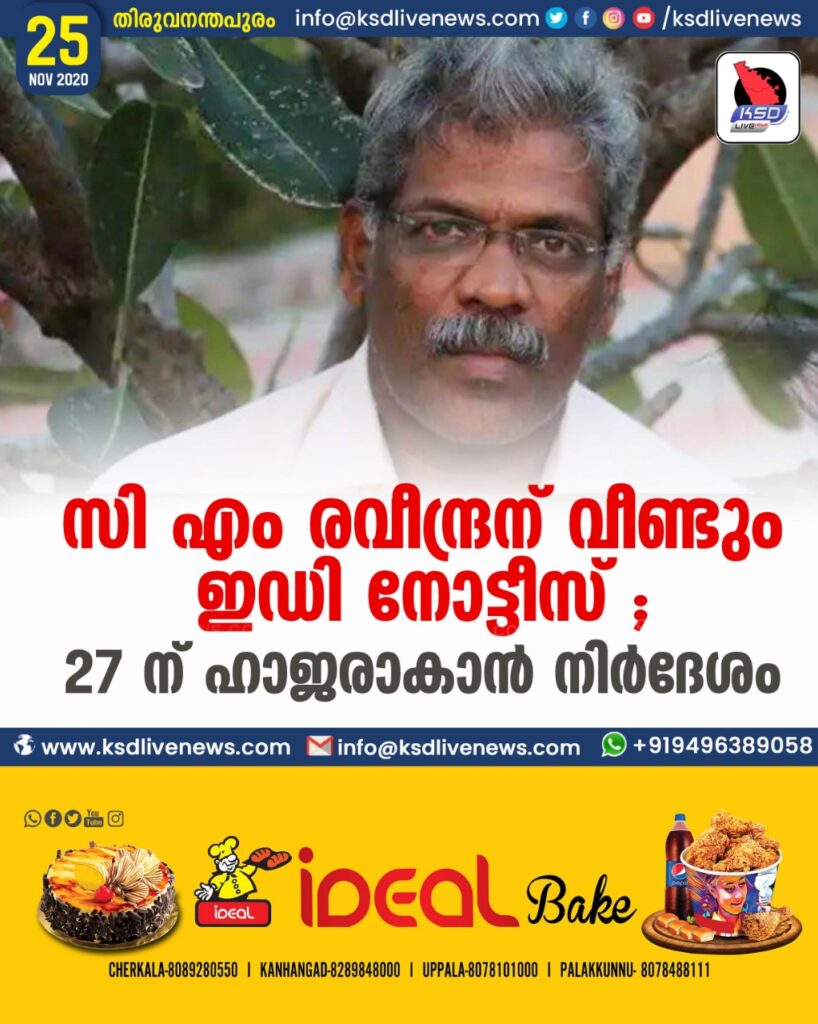 സി എം രവീന്ദ്രന് വീണ്ടും ഇഡി നോട്ടീസ് ; 27 ന് ഹാജരാകാൻ നിർദേശം