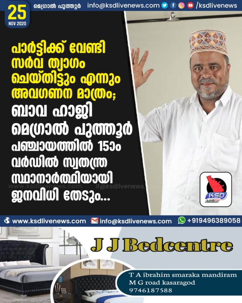 പാർട്ടിക്ക് വേണ്ടി സർവ ത്യാഗം ചെയ്തിട്ടും എന്നും അവഗണന മാത്രം;ബാവ ഹാജി മെഗ്രാൽ പുത്തൂർ പഞ്ചായത്തിൽ 15ാം വർഡിൽ സ്വതന്ത്ര സ്ഥാനാർത്ഥിയായി ജനവിധി തേടും
