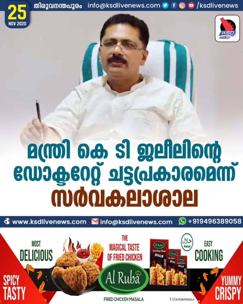 മന്ത്രി കെ ടി ജലീലിന്റെ ഡോക്ടറേറ്റ് ചട്ടപ്രകാരമെന്ന് സർവകലാശാല