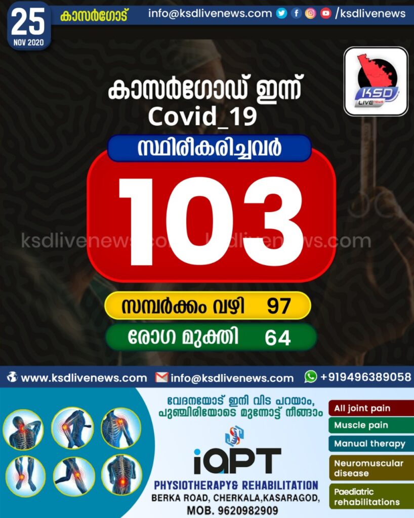 കാസര്‍കോട് ജില്ലയില്‍ 103 പേര്‍ക്ക് കോവിഡ്, 64 പേര്‍ക്ക് രോഗമുക്തി
