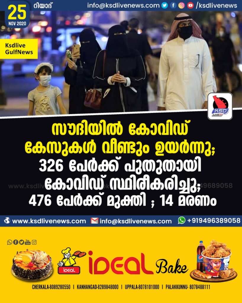 റിയാദ്: സൗദി അറേബ്യയിൽ പുതിയ കോവിഡ് കേസുകളുടെ എണ്ണത്തിൽ വീണ്ടും വർധന . രണ്ടാഴ്ചക്ക് ശേഷം പുതിയ രോഗികളുടെ പ്രതിദിന കണക്ക് 300 ന് മുകളിലായി . ബുധനാഴ്ച 326 പേർക്കാണ് പുതുതായി രോഗം സ്ഥിരീകരിച്ചത് . 476 പേർ കൂടി കോവിഡ് മുക്തരായി . എന്നാൽ മരണനിരക്ക് വീണ്ടും താഴ്സന്നു . രാജ്യത്ത് വിവിധ ഭാഗങ്ങളിലായി ബുധനാഴ്ച 14 മരണങ്ങളാണ് റിപ്പോർട്ട് ചെയ്തത് . ആകെ കോവിഡ് കേസുകളുടെ എണ്ണം 356067 ആയി . രോഗമുക്തരുടെ ആകെ എണ്ണം 344787 ആയി ഉയർന്നു . ആകെ മരണസംഖ്യ 5825 ആണ് . ചികിത്സയിലുള്ള കോവിഡ് ബാധിതരുടെ എണ്ണം 5455 ആയി കുറഞ്ഞു . ഇതിൽ 724 പേർ മാത്രമാണ് വരുതരാവസ്ഥയിലുള്ളത് . ഇവർ തീവ്രപരിചരണ വിഭാഗത്തിലാണ് . രാജ്യത്തെ കോവിഡ് മുക്തി നിരക ശതമാനമായി . മരണനിരക്ക് 1.6 ശതമാനമായി തുടരുന്നു .24 മണിക്കൂറിനിടെ രാജ്യത്ത് പുതിയ കോവിഡ് കേസുകൾ ഏറ്റവും കൂടുതൽ റിപ്പോർട്ട് ചെയ്തത് റിയാദിലാണ് , 61. മക്ക 27 , മദീന 26 , ജിദ്ദ 17 , യാംബു 16 , ദമ്മാം 10 , ബുറൈദ 9 , ഖമീസ് മുശൈത് 9 , ഹാഇൽ 9 , ഉനൈസ് 8 , നജ്റാൻ 7 , മജ്മഅ 7 , മുസാഹ് മിയ 7 , വാദി ദവാസിർ 7 എന്നിങ്ങനെയാണ് പ്രധാന നഗരങ്ങളിൽ പുതുതായി രേഖപ്പെടുത്തിയ കോവിഡ് രോഗികളുടെ എണ്ണം .