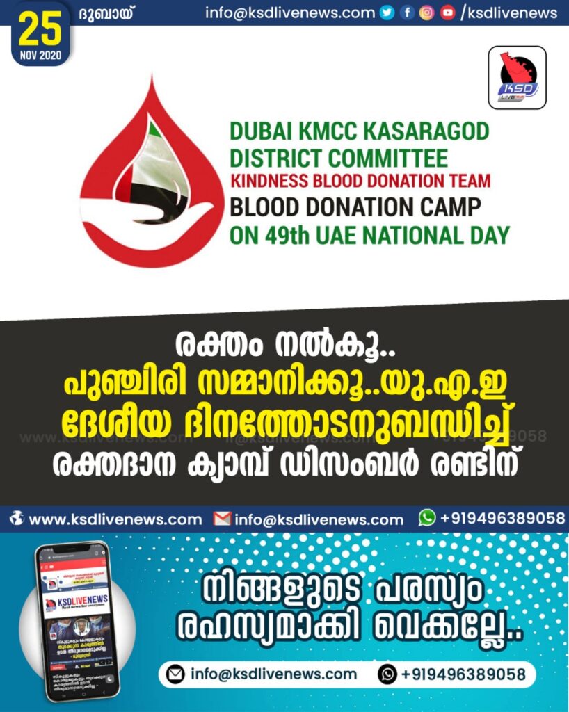 രക്തദാനത്തിലൂടെ ഓരോ ജീവനുകൾ രക്ഷിക്കുന്നതോടൊപ്പം തന്നെ ആ കുടുംബത്തിനു പുഞ്ചിരിയാണു നാം സമ്മാനിക്കുന്നത്. യു.എ.ഇ ദേശീയ ദിനത്തിനോടനുബന്ധിച്ച് നടത്തുന്ന രക്തദാന ക്യാമ്പിലൂടെ നമ്മുടെ പോറ്റമ്മയായ യു.എ.ഇക്കു രാഷ്ട്രസേവനമാണു നാം ചെയ്യുന്നത്. രക്തം ദാനം ചെയ്യുന്നതിലൂടെ രക്തദാതാവ് രാജ്യത്തിനു പുഞ്ചിരി നൽകുന്നു എന്ന മഹത്തായ സന്ദേശമാണു ഈ ഒരു മെഗാ രക്തദാന ക്യാമ്പിലൂടെ സമൂഹത്തിനു നൽകുന്നതെന്ന് ദുബായ് കെ എം സി സി കാസറഗോഡ് പ്രസിഡന്റ് അബ്ദുല്ല ആറങ്ങാടി ജില്ലാ ആക്ടിങ് പ്രസിഡന്റ് റാഫി പള്ളിപ്പുറം ജനറൽ സെക്രട്ടറി സലാം കന്യപ്പാടി ട്രഷറർ ഹനീഫ് ടി ആർ മേൽപറമ്പ് കൈൻഡ്നെസ്സ് ബ്ലഡ് ഡോനെഷൻ ടീം ഭാരവാഹികളായ അന്വര് വയനാട് സിയാബ് തെരുവത് എന്നിവർ പറഞ്ഞു. ദുബായ് കെ എം സി സി കാസറഗോഡ് ജില്ലാ കമ്മിറ്റിയുടെ ഭാരവാഹികളുടെ യോഗത്തിൽ ആക്ടിങ് പ്രസിഡന്റ് റാഫി പള്ളിപ്പുറം അധ്യക്ഷത വഹിച്ചു ജനറൽ സെക്രട്ടറി സലാം കന്യപ്പാടി സ്വാഗതം പറഞ്ഞു ഭാരവാഹികളായ മഹ്മൂദ് ഹാജി പൈവളിഗെ , സി എച്. നൂറുദ്ദിൻ കാഞ്ഞങ്ങാട് , അബ്ദുറഹ്മാൻ ബീച്ചാരക്കടവ് , അഡ്വക്കേറ്റ് ഇബ്രാഹിം ഖലീൽ , കെ പി അബ്ബാസ് കളനാട് , സലാം തട്ടാനാച്ചേരി ,ഫൈസൽ മൊഹ്സിന് തളങ്കര . തുടങ്ങിയവർ പ്രസംഗിച്ചു ജില്ലാ ട്രഷറർ ഹനീഫ് ടി ആർ മേൽപറമ്പ് നന്ദി പറഞ്ഞു