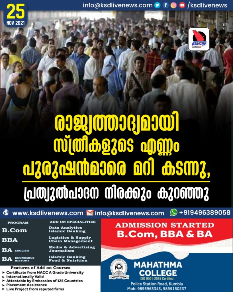 രാജ്യത്താദ്യമായി സ്ത്രീകളുടെ എണ്ണം പുരുഷന്മാരെ മറികടന്നു, പ്രത്യുല്പാദന നിരക്കും കുറഞ്ഞു