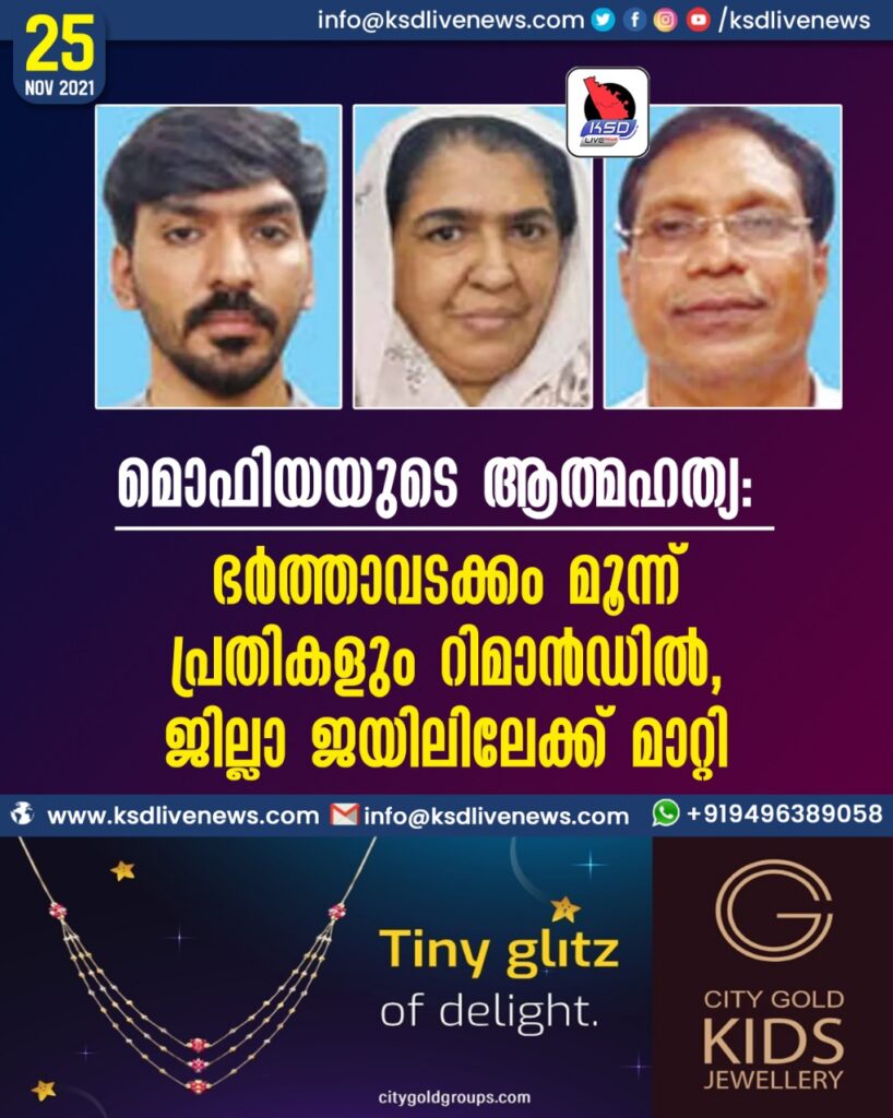 മൊഫിയയുടെ ആത്മഹത്യ: ഭര്ത്താവടക്കം മൂന്ന് പ്രതികളും റിമാന്ഡില്, ജില്ലാ ജയിലിലേക്ക് മാറ്റി