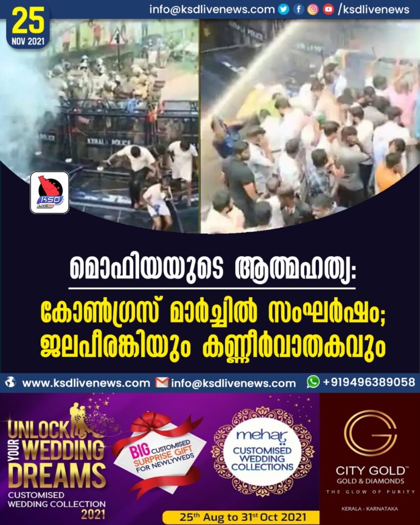 മൊഫിയയുടെ ആത്മഹത്യ: കോണ്ഗ്രസ് മാര്ച്ചില് സംഘര്ഷം; ജലപീരങ്കിയും കണ്ണീര്വാതകവും