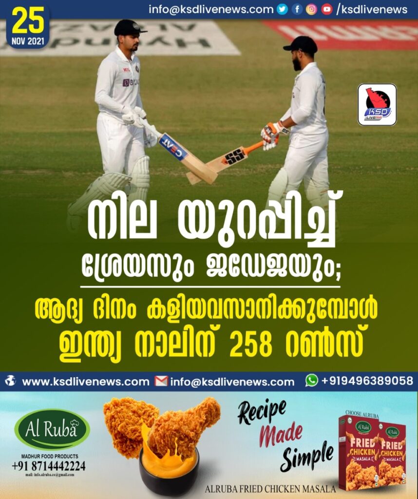 നിലയുറപ്പിച്ച് ശ്രേയസും ജഡേജയും; ആദ്യ ദിനം കളിയവസാനിക്കുമ്പോള് ഇന്ത്യ നാലിന് 258 റണ്സ്