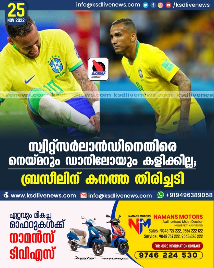 സ്വിറ്റ്സര്ലാന്ഡിനെതിരെ നെയ്മറും ഡാനിലോയും കളിക്കില്ല; ബ്രസീലിന് കനത്ത തിരിച്ചടി