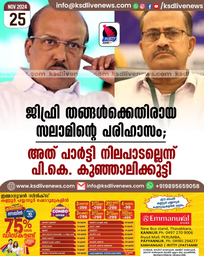 ഇതിനുപിന്നാലെയാണ് കുഞ്ഞാലിക്കുട്ടി അത്തരം പരാമര്‍ശങ്ങള്‍ പാര്‍ട്ടി രീതിയല്ലെന്നു വ്യക്തമാക്കിയത്. ജിഫ്രി തങ്ങളെ പരിഹസിച്ചെന്ന ആരോപണം പി.എം.എ. സലാം തന്നെ നിഷേധിച്ചിട്ടുണ്ടെന്നും എങ്കിലും ആ നിലയ്ക്ക് ആളുകള്‍ ധരിക്കുന്നതുകൊണ്ടാണ് അതു പാര്‍ട്ടി നിലപാടല്ലെന്ന് വ്യക്തമാക്കുന്നതെന്നും കുഞ്ഞാലിക്കുട്ടി പറഞ്ഞു. സാദിഖലി തങ്ങളോട് ആലോചിച്ചശേഷമാണ് ഇങ്ങനെ പറയുന്നത്. ഇക്കാര്യം സലാമിനെയും അറിയിച്ചു.