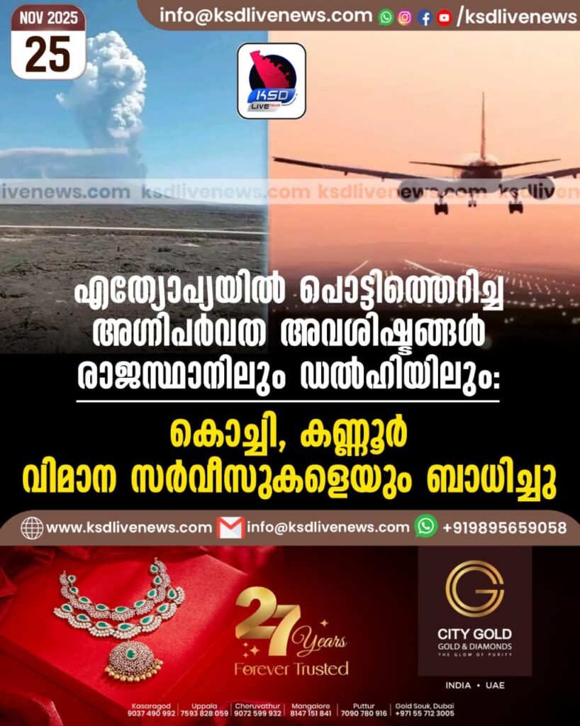 എത്യോപ്യയിൽ പൊട്ടിത്തെറിച്ച അഗ്നിപർവത അവശിഷ്ടങ്ങൾ രാജസ്ഥാനിലും ഡൽഹിയിലും: കൊച്ചി,കണ്ണൂര് വിമാന സർവീസുകളെയും ബാധിച്ചു