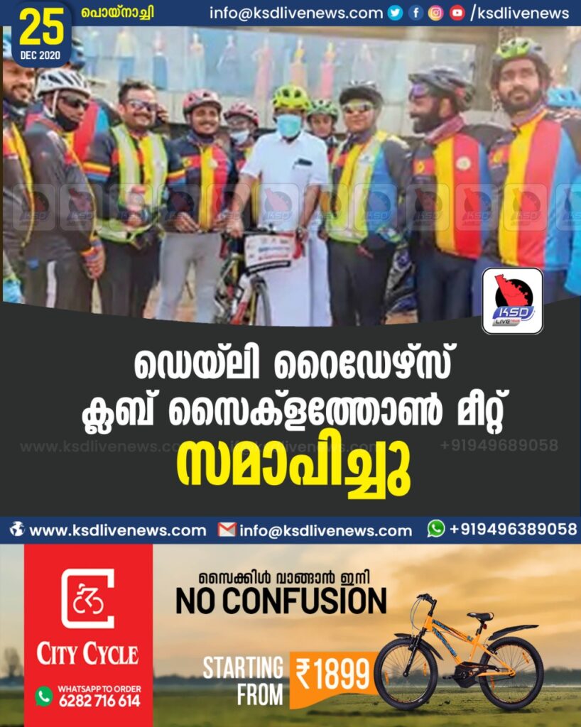 പൊയിനാച്ചി: ഡെയ്ലി റൈഡേഴ്സ് ക്ലബ്ബ് സൈക്ളത്തോൺ മീറ്റ് സമാപിച്ചു. കുദ്രോളി വേൾഡ്, ഇസ്ക്കോ ഗ്രൂപ്പ് ഓഫ് കമ്പനി എന്നിവയുമായി സഹകരിച്ചായിരുന്നു പരിപാടി. എൻ.എ.നെല്ലിക്കുന്ന് എം.എൽ.എ. ഉദ്ഘാടനംചെയ്തു. ക്ലബ്ബ് പ്രസിഡന്റ് അഡ്വ. ഫൈസൽ അധ്യക്ഷതവഹിച്ചു. പി.ബി.റിഷാദ് റൈഡർമാർക്കുള്ള ബാഡ്ജുകൾ കൈമാറി. മൊയ്തീൻ ഹാജി പൊയിനാച്ചി, ഗഫൂർ ബേവിഞ്ച എന്നിവർ സംസാരിച്ചു.