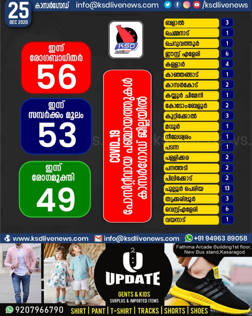 കാസർഗോഡ് ജില്ലയിൽ ഇന്ന് കോവിഡ് സ്ഥിരീകരിച്ചവരുടെ പഞ്ചായത്ത് തിരിച്ചുള്ള സ്ഥിതി വിവര കണക്ക്