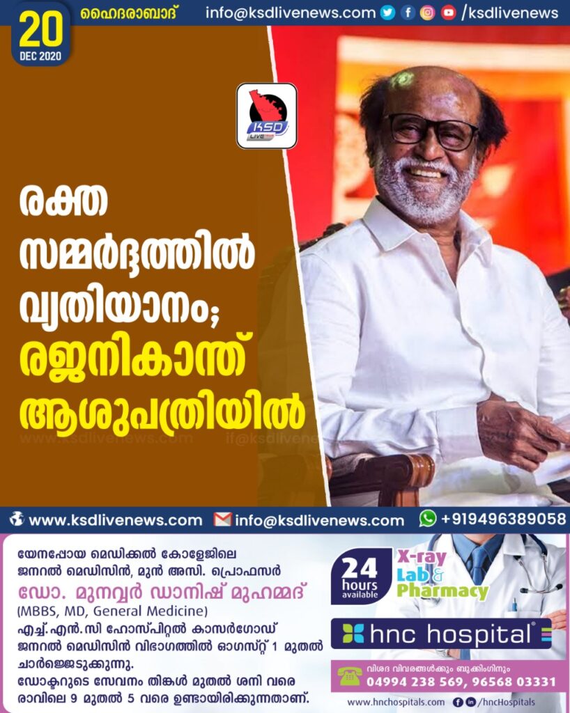 രക്തസമ്മർദ്ദത്തിൽ വ്യതിയാനം ; രജനി കാന്ത് ആശുപത്രിയിൽ