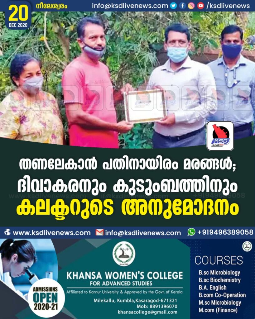 തണലേകാൻ പതിനായിരം മരങ്ങൾ ; ദിവാകരനും കുടുംബത്തിനും കലക്ടറുടെ അനുമോദനം
