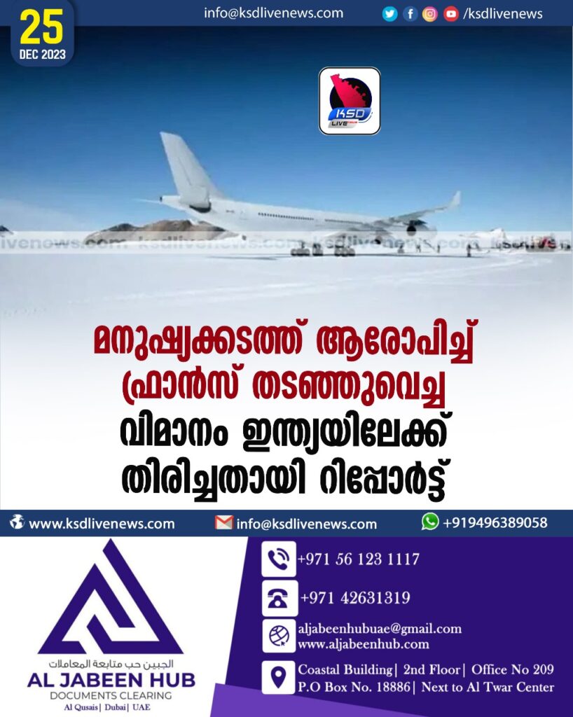 മനുഷ്യക്കടത്ത് ആരോപിച്ച്‌ ഫ്രാൻസ് തടഞ്ഞുവെച്ച വിമാനം ഇന്ത്യയിലേക്ക് തിരിച്ചതായി റിപ്പോര്‍ട്ട്