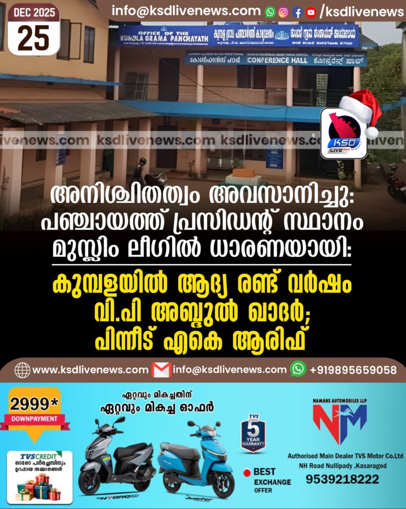പഞ്ചായത്ത് പ്രസിഡൻ്റ് സ്ഥാനം മുസ്ലിം ലീഗിൽ ധാരണയായി: കുമ്പളയിൽ ആദ്യ രണ്ട് വർഷം വി.പി അബ്ദുൽ ഖാദർ; പിന്നീട് എ.കെ ആരിഫ്