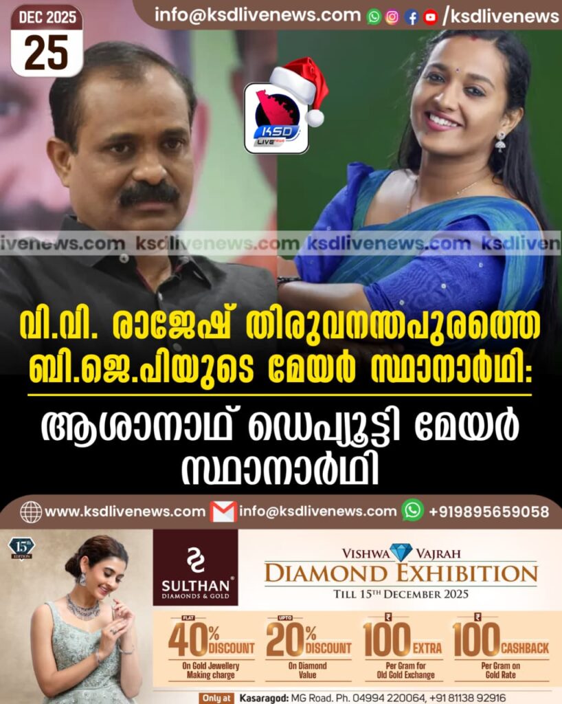 വി.വി. രാജേഷ് തിരുവനന്തപുരത്തെ ബിജെപിയുടെ മേയർ സ്ഥാനാർഥി: ആശാനാഥ് ഡെപ്യൂട്ടി മേയർ സ്ഥാനാർഥി